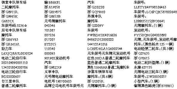 下列機(jī)動(dòng)車因在本市道路及居民小區(qū)長(zhǎng)期停放在2022年9月31日前已由義烏市公安局交通監(jiān)察大隊(duì)、義烏市綜合行政執(zhí)法局依法清理至停車場(chǎng)統(tǒng)一停放,現(xiàn)予以公告,請(qǐng)以下機(jī)動(dòng)車車主自登報(bào)之日起三個(gè)月內(nèi)攜車輛有效資料到交警大隊(duì)處罰中心(西城路88號(hào))處理,逾期按無(wú)主車輛予以處理。 義烏市公安局交通警察大隊(duì) 義烏市綜合行政執(zhí)法局 |