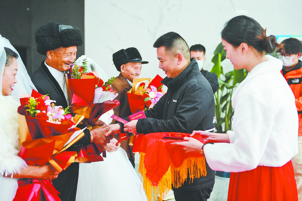 工作人員為銀發(fā)老人頒發(fā)補(bǔ)領(lǐng)的新結(jié)婚證。 12月7日上午,“千年撥浪揚(yáng)甜蜜,百年紅妝展幸!濒吡x烏市集中補(bǔ)證宣傳活動(dòng)第四站廿三里補(bǔ)證儀式在廿三里公交樞紐站舉行。活動(dòng)現(xiàn)場,9位銀發(fā)奶奶穿上婚紗、胸佩紅花,笑逐顏開地挽著伴侶,領(lǐng)取補(bǔ)證后的新結(jié)婚證和對(duì)戒等禮物,還收獲了真摯的祝福。 “1961年我們結(jié)婚的時(shí)候很簡單的,沒有儀式,也沒有酒席,就介紹人陪著兩個(gè)人走過去的!敝旖鹈览先苏f,“日子雖然苦,但我們倆感情挺好的。現(xiàn)在三個(gè)子女都已成家立業(yè),我們開始享福啰! “沒想到活了大半輩子,老了還能再補(bǔ)辦一個(gè)結(jié)婚儀式,很高興啊……”88歲的陳仁錫老人在鏡頭前笑得合不攏嘴。 據(jù)悉,為進(jìn)一步深化“互聯(lián)網(wǎng)+政務(wù)服務(wù)”和婚姻登記數(shù)字化改革,完善婚姻登記數(shù)據(jù)檔案,年初以來,市民政局在全市范圍內(nèi)集中開展補(bǔ)領(lǐng)婚姻登記證和補(bǔ)辦結(jié)婚登記證工作。廿三里街道是全市集中補(bǔ)領(lǐng)婚姻登記證第四個(gè)巡回點(diǎn)。11月份,市民政局在廿三里公交樞紐站增設(shè)了4個(gè)婚姻登記證補(bǔ)領(lǐng)窗口,在“家門口”為8000多名老人免費(fèi)提供補(bǔ)領(lǐng)結(jié)婚證登記巡回服務(wù),受到群眾的一致好評(píng)。 截至當(dāng)天,市民政局已為全市23778對(duì)夫妻完成補(bǔ)領(lǐng)補(bǔ)辦結(jié)婚證,切實(shí)解決了早年歷史檔案數(shù)據(jù)缺失問題,維護(hù)了婚姻當(dāng)事人合法權(quán)益。 “集中補(bǔ)領(lǐng)婚姻登記證活動(dòng),是我市扎實(shí)推進(jìn)婚俗改革、積極探索創(chuàng)新形式的又一創(chuàng)舉,也是我市加大文明婚俗宣傳力度,深入挖掘義烏孝親文化題材,賦予新時(shí)代文明理念的再實(shí)踐!笔忻裾窒嚓P(guān)負(fù)責(zé)人介紹,我市把構(gòu)建婚姻家庭文化活動(dòng)、傳承優(yōu)良家風(fēng)家訓(xùn)、深入推進(jìn)婚俗改革,作為不斷滿足人民群眾新時(shí)代婚姻家庭實(shí)際需求抓實(shí)抓好,不斷豐富婚俗改革的時(shí)代內(nèi)涵和時(shí)間載體,帶動(dòng)社會(huì)和群眾共同參與,營造移風(fēng)易俗的良好氛圍,樹文明鄉(xiāng)風(fēng)、文明新風(fēng),共享文明婚俗文化新成果。 |
