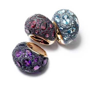 波米雷特Nudo系列采用玫瑰金和白金配檸檬晶,石榴石,馬德拉石、白色托帕石、藍(lán)色托帕石、煙晶或紫,造型簡單,寶石通透明亮。 |