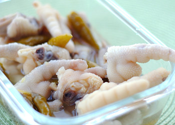 材料:雞爪 調(diào)料:泡椒、白醋、生姜、蒜瓣、花椒、香葉、八角、桂皮、鹽、雞精、純凈水 做法: 1、首先將雞爪洗干凈,然后用刀把雞爪劈成兩半,方便入味。準(zhǔn)備好香料。 2、雞爪放入鍋中,加生姜,蒜瓣,花椒,香葉,八角,桂皮,鹽。 3、煮約13分鐘至雞爪煮熟,不可太爛。 4、將雞爪撈出來(lái),放在自來(lái)水底下沖涼,這樣可以避免后來(lái)出現(xiàn)肉凍,把膠質(zhì)都沖走了,然后晾涼。 5、準(zhǔn)備一個(gè)玻璃或瓷質(zhì)的容器,放入泡椒及泡椒水。 6、再加些純凈水或涼白開(kāi)也可以,再倒入適量的白醋,攪拌均勻后加入雞精和鹽。 7、將涼了的雞爪扔到泡椒水里去,蓋上蓋子,讓它自己入味。 |