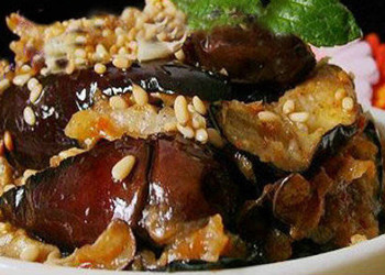 主料:長嫩茄子400克。 配料:松籽50克,濕淀粉10克,色拉油750克。 調(diào)料:碘鹽5克。味精4克,白糖10克,醋5克,醬油6克,蔥丁3克,姜末3克,蒜片3克,湯75克。 制作: (1)茄子去蒂洗凈去皮,一切兩半,再切十字花刀后,改成6厘米X6厘米的塊。 (2)勺內(nèi)放油,燒六七成熱,放入茄花炸成金黃色,撈出瀝油。 (3)勺內(nèi)留少許底油,燒三四成熱,放入松籽炒出香味,加蔥丁,姜末,蒜片,醬油,湯,鹽,味素,醋,糖,料酒,炸好的茄花,燒開,用濕淀粉勾芡, 點(diǎn)香油,裝盤即好。 |