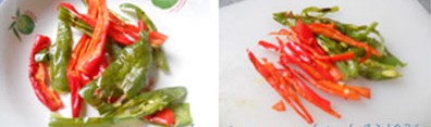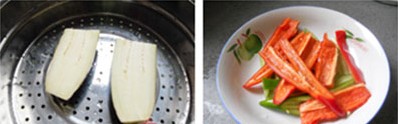 原料:長(zhǎng)茄子1條、紅尖椒1個(gè)、綠尖椒1個(gè)、蒜3瓣、小蔥1截、鹽少許、糖少許、白醋適量。 做法: 1、微波可蒸鍋加入適量清水,架上蒸籠,茄子洗凈切大塊,放入蒸籠,高火蒸15分鐘; 2、紅、綠尖椒洗凈,切成寸段; 3、微波高火加熱5分鐘,烤至表皮微微起皺; 4、將烤過(guò)的尖椒切成細(xì)絲;