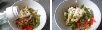 5、蒸熟的茄子只取瓤,用手撕成細(xì)絲; 6、加入尖椒絲、少許細(xì)鹽和細(xì)砂糖; 7、加入適量白醋; 8、加入蒜泥和蔥花,拌勻即可。
