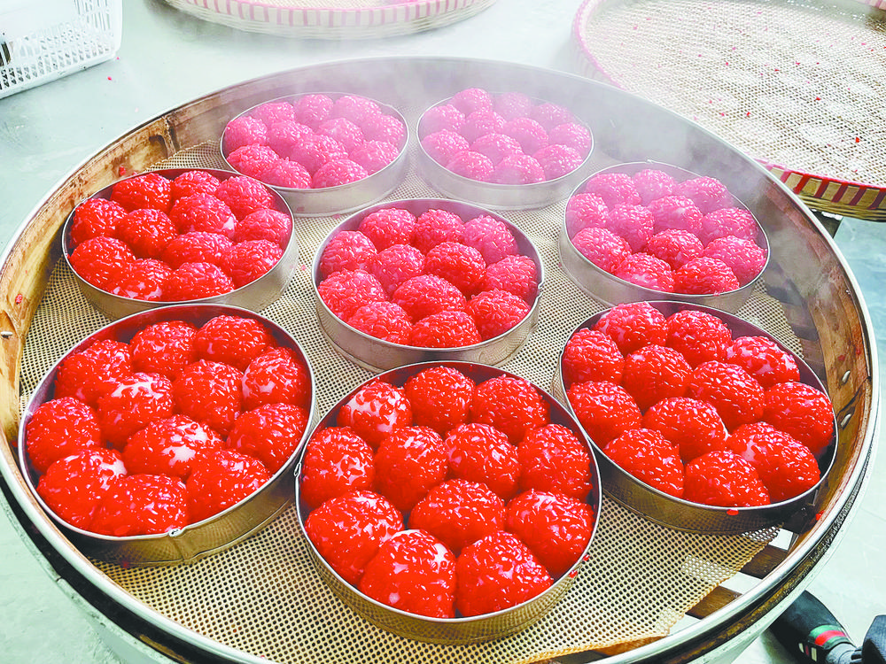 一顆紅彤彤的糯米團(tuán)子,咬上一口,由外到里透出紅、白、黑三層,中間溢出濃濃的芝麻餡兒,一股腦兒流經(jīng)舌尖,滿嘴香甜,仿佛身心都愉悅起來,恨不得吃上一籠過把嘴癮,這便是義烏特色美食紅粿的魅力。 新春佳節(jié),家家戶戶張燈結(jié)彩、喜氣洋洋,百姓飯桌上也會(huì)出現(xiàn)一道紅粿,寓意紅紅火火,日子更甜。為吃上新鮮可口的紅粿,許多百姓會(huì)特意跑到尚陽老街購買。據(jù)悉,老街上這家看似普普通通的紅粿作坊,已勤勤懇懇運(yùn)轉(zhuǎn)24年,店主金云芳與丈夫朱益民一心精耕紅粿制作技藝,在漫長歲月中逐漸積累人氣。 尚陽紅粿“忙”了一個(gè)春節(jié) 當(dāng)清晨第一縷陽光灑進(jìn)尚陽老街小巷弄的一棟平房里,早早開門的金云芳與朱益民手里的活就沒停下過,調(diào)餡兒、備糯米,再和面皮、捏紅粿,作坊內(nèi)各種忙碌的聲音夾雜在一塊兒,開啟熱火朝天的一天。 “今天訂20籠紅粿,我吃完午飯后來拿!币淮笤纾瑥母L锝值老埋樥h(yuǎn)道而來的老客戶駱紅亞迫不及待下了訂單。她說,去年初買過一次尚陽紅粿,家人吃后一致叫好,不僅糯米配方剛合適,而且紅糖、芝麻原材料品質(zhì)都不錯(cuò),價(jià)格也實(shí)惠。此后,駱紅亞每次來尚陽之前都會(huì)提前與金云芳微信聯(lián)系,一年內(nèi)跑好幾趟,只為讓家人吃到新鮮出爐的紅粿。 這家紅粿緣何口味極佳?走進(jìn)小小作坊,金云芳正用和面機(jī)嫻熟地和面團(tuán),而她提前用紅糖、板油和芝麻調(diào)好的餡兒,散發(fā)出濃郁的香味,一旁放著染好的紅色糯米。所有原材料備齊后,金云芳手腳麻利地做面皮、放餡料,朱益民則將做好的小面團(tuán)扔進(jìn)紅糯米中,用手揉搓直到整個(gè)面團(tuán)表面均勻粘上紅糯米,然后將做好的紅粿按1小籠12個(gè)裝,一般8小籠就會(huì)裝滿一個(gè)大蒸籠,再把大蒸籠放進(jìn)鍋內(nèi)蒸煮即可!罢糁蟮幕鸷蚝蜁r(shí)間要盯牢,時(shí)間過長容易黏,時(shí)間過短又不軟,這就需要長期經(jīng)驗(yàn)積累了!敝煲婷裾f。 有尚陽村民臨時(shí)跑來買,只為招待當(dāng)天的客人;有嫁到衢州、開化的尚陽女兒提前預(yù)訂,只為讓婆家品嘗家鄉(xiāng)特色美食;有和酒店合作的訂單,當(dāng)天限時(shí)定點(diǎn)送達(dá);有從蘇溪、廿三里、北苑等方向趕來的客戶,一次就要幾十籠,既可餐桌共享,又能拿來送人……從去年12月到今年元宵,金云芳夫妻倆只在大年初一休息了半天。 “紅粿不能提前做,剛出籠的最新鮮好吃。有幾次我還沒起床,就有村民敲門,想提前訂新鮮的紅粿。”金云芳笑著說。 20多年鉆研“打”出好口碑 逢年過節(jié),紅粿的香甜飄滿尚陽的街巷,老客戶尋味而來,穿過彎繞的小巷,等待出爐的紅粿,滿載而歸。 金云芳家的紅粿總讓人無比回味,這離不開制作紅粿的精湛手藝,更離不開手藝人長年累月的學(xué)習(xí)與鉆研。1999年,金云芳婆婆在佛堂下市菜市場買了個(gè)攤位!爱(dāng)時(shí)菜市場里許多紅粿都從城里拿,價(jià)格貴、味道一般,婆婆說自己做的紅粿好吃多了,為何不自己做了賣呢?”于是,一家人開始做紅粿生意。 做紅粿看似簡單,制作起來卻有些難度。從最初調(diào)餡料,到后來和面、捏紅粿,金云芳不知道練習(xí)了多少次,調(diào)試了多少回!白约撼灾贸,才能放心賣給別人,要做良心生意!边@是金云芳的原則。每次調(diào)試完口味,她都要細(xì)細(xì)品嘗,直到自己滿意為止。這些年,金云芳和朱益民一直在研究紅粿口感,如何讓出爐的紅粿顆顆分明,吃時(shí)口感軟糯又不容易互相粘連,每一個(gè)高要求的背后,都是日以繼夜的學(xué)習(xí)和練習(xí)。 2019年,尚陽老房子重新修建后,金云芳和朱益民將作坊從佛堂搬回尚陽,并進(jìn)購和面機(jī)、蒸鍋等設(shè)備。從婆婆那里學(xué)來的手藝,在金云芳和丈夫改良下越做越好,尚陽紅粿逐漸“打”出好口碑,名氣甚至傳出義烏、傳出浙江。 紅粿一般為造新房、滿月酒、紅白喜事而備,一有訂單量就很大。“之前杭州有個(gè)客戶預(yù)訂幾百籠紅粿,直接快遞寄過去,還有個(gè)湖北人打來電話,他們開度假酒店,也想推出紅粿這道點(diǎn)心。”金云芳笑著說,像春節(jié)期間,因?yàn)橛唵瘟刻螅荒芨鶕?jù)先來后到原則接單,有些晚來的或臨時(shí)的訂單都來不及接。據(jù)統(tǒng)計(jì),春節(jié)前后半個(gè)月,金云芳家紅粿銷售量達(dá)到6000多籠,最忙那幾天,每天要做500籠紅粿。 “紅粿是義烏人飯桌上少不了的特色點(diǎn)心,多年傳承至今,我們不能讓它失傳了!苯鹪品寂畠涸谄溆绊懴,也能做出美味的紅粿。不僅如此,金云芳堅(jiān)持物美價(jià)廉的原則,平時(shí)每籠紅粿只賣10元!鞍丫W⒃谔嵘t粿品質(zhì)上,而不是價(jià)格上,希望紅粿能為義烏人的鄉(xiāng)愁增添一些甜味! |