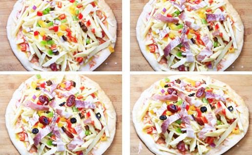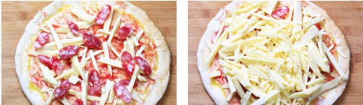 13、撒上香腸; 14、撒上四分之三奶酪; 15、少量蔬菜丁及蘑菇片點綴; 16、撒上培根; 17、撒上圣女果,橄欖圈; 18、餅邊兩公分寬不放餡料,刷橄欖油; 19、上下火預(yù)熱至一百八十至兩百度,烤盤涂色拉油; 20、加熱七八分鐘至餅邊帶焦黃,奶酪變成膏狀即可。(因為家用烤箱常存在較大溫度誤差,甚至可以達到四十度之多,所以要視情形作適當調(diào)整)