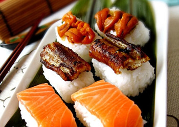 材料:熱米飯、鮭魚刺身、紫海膽、淹漬好的鰻魚肉;