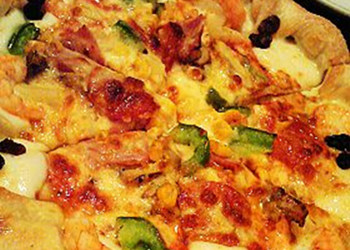 材料:面團、番茄醬、黑胡椒粉、洋蔥、甜椒、臘腸、芝士、蝦仁。