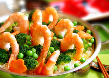 材料:蝦400克、西藍(lán)花300克、熟青豆50克、胡蘿卜100克、姜20克、蔥1段、黃油30克、乳酪30克 做法: 1、姜切細(xì)絲、胡蘿卜切片備用。 2、西藍(lán)花分割成小塊,在清水中迅速延一個方向攪拌撈起,再在加了鹽的熱水中燙熟。 3、大蝦用4杯清水、加姜絲、蔥段、8克鹽一起入鍋里煮熟。 4、撈出蝦,去殼備用,保留尾巴上的一小截殼,這樣吃的時候很方便。 5、把洗干凈的3杯米,加入到煮蝦的湯里面,米和湯的比例為3:4。 6、再加入黃油、乳酪、胡蘿卜,攪拌均勻,用中小火燜熟米飯。 7、最后加入去殼的蝦子、和燙熟的西藍(lán)花、熟青豆,撒上胡椒粉,就可以了。 |