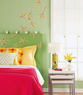 貼紙裝點床頭 床頭的背景墻和床頭板都是純綠色,色度不一樣,可在建材賣場或網(wǎng)上購買墻貼,挑選跟綠背景顏色呼應的花朵圖案最能展現(xiàn)春的氣息。而且背景墻和背板選擇一致的圖案,統(tǒng)一性會使裝飾更顯協(xié)調。 靈感之處:不需要有繪畫功底,免去了自己手繪墻面的麻煩,只需簡單的貼紙就可以打造一個花枝妖嬈的墻面,改變墻面的風格。 |