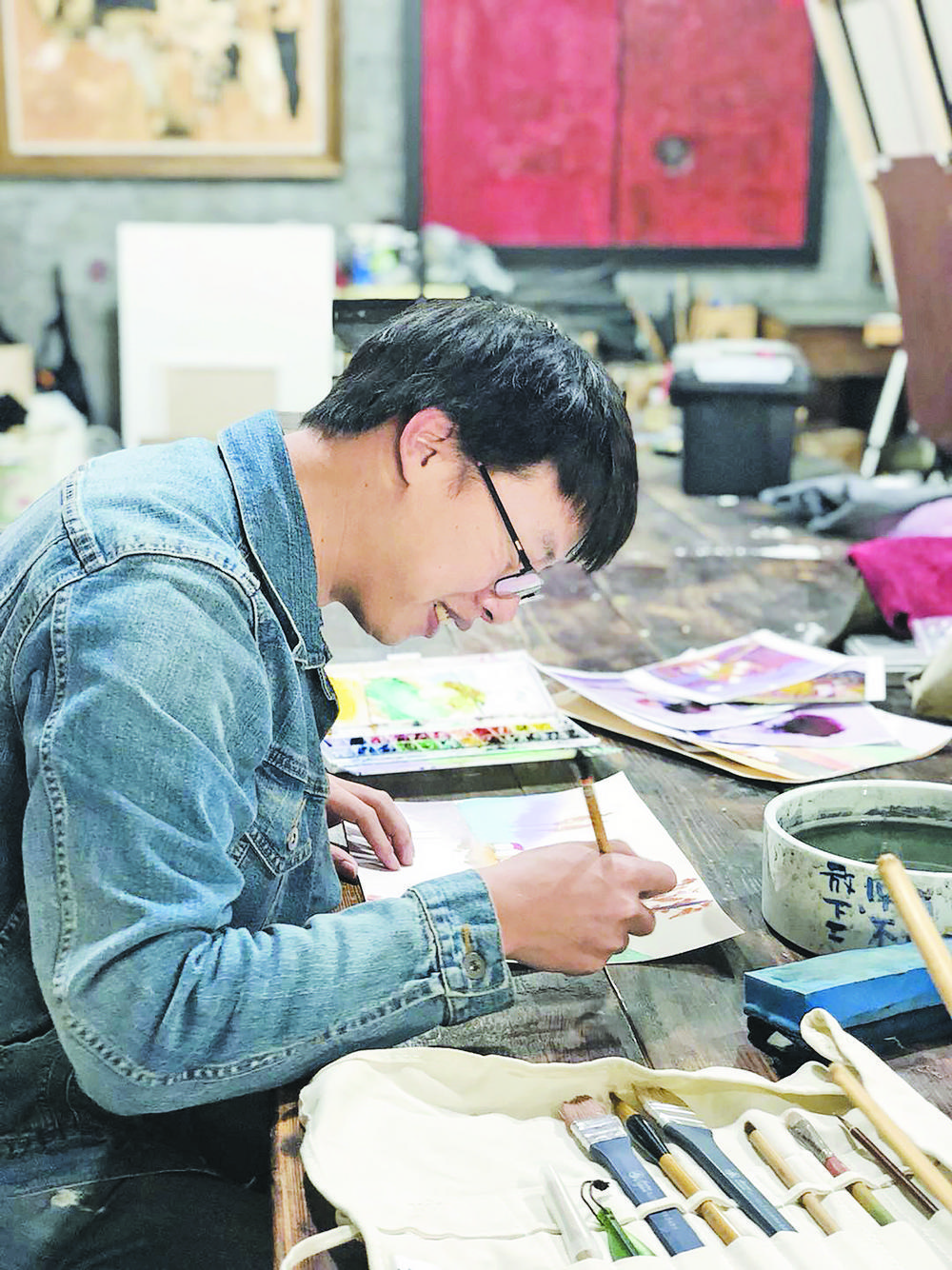 義烏之心南門咖啡館里,油畫家樓健森喜歡坐在吧臺(tái)一側(cè)的拐角處,聞著咖啡香味、聽著各色音樂、感受生活氣息、沉淀藝術(shù)感悟……這里就是他創(chuàng)作的一方天地。當(dāng)記者如約見到樓健森時(shí),映入眼簾的正是這樣一幕,既獨(dú)特又和諧。 樓健森,大陳鎮(zhèn)溪后村人,金華市美術(shù)家協(xié)會(huì)會(huì)員、浙江省油畫家協(xié)會(huì)會(huì)員。近年來,他創(chuàng)作的《塔影》《春》《盛世安寧10》《商城印象5》等多幅油畫作品先后入選浙江省級(jí)美術(shù)作品展;《平凡而偉大》入選慶祝中國人民解放軍建軍95周年全國美術(shù)作品展覽暨第15屆全軍美術(shù)作品展。值得一提的是,作品《春風(fēng)又綠江南岸》接連入選“2020上海油畫作品展”“萬象更新——2021浙江省油畫作品展”“詩意江南——2022中國油畫作品展”。 “我是一個(gè)1981年生的未婚單身大叔!睒墙∩χf,他給自己的畫像是一個(gè)不自律沉迷于畫畫的人、一個(gè)目標(biāo)驅(qū)動(dòng)型的理工科男、一個(gè)物欲極低的理想主義者。 緣起一萬小時(shí)定律 與很多畫家從小開始學(xué)習(xí)繪畫不同,樓健森是“半路出家”,進(jìn)入大學(xué)校園后,他才開始系統(tǒng)地進(jìn)行繪畫基本功練習(xí)。 “我學(xué)的專業(yè)是服裝設(shè)計(jì)與工程,這當(dāng)中,現(xiàn)代抽象藝術(shù)奠基人——瓦西里·康定斯基提出的構(gòu)成主義深深影響了我,甚至很大程度上奠定了我的繪畫基調(diào)。” 大學(xué)畢業(yè)后,他一度入世多個(gè)行業(yè)!白霾邉潟r(shí),我常;ㄙM(fèi)一兩個(gè)小時(shí),只為給每一位客戶發(fā)送節(jié)日祝福短信。但這并不是我想要的生活。”回首過往,樓健森感慨。 當(dāng)自由撰稿人的理想職業(yè)幻滅后,他拿起了久違的畫筆!2015年初,好奇于繪畫滿一萬小時(shí)后會(huì)怎樣,我開始練習(xí),這就是現(xiàn)今一切的起點(diǎn)……” 從堅(jiān)持練習(xí)速寫和人像開始,畫墻繪、畫水彩,樓健森一步一個(gè)腳印,在繪畫的道路上穩(wěn)步前進(jìn)。2017年底,他接觸了油畫,至此便愛上了這一表達(dá)形式。 攪攪攪、抹抹抹、擦擦擦………畫畫的時(shí)間總是過得特別快,一上午就糊了幾個(gè)色塊。在他的朋友圈里充斥著這樣的文字,記錄著他執(zhí)著油畫的過程:物理世界里,一直在“住處—星巴克—畫室”間來來回回;畫畫時(shí)最吸引人的狀態(tài)就是沉浸忘我,進(jìn)入一個(gè)與世隔絕的平和之境,欲望和紛擾都被摒除在方寸之外;此間沉靜,唯畫與我。 2019年3月,進(jìn)行主觀色調(diào)控制練習(xí),4個(gè)月后,進(jìn)入色彩感知練習(xí);2020年,學(xué)習(xí)外國現(xiàn)當(dāng)代藝術(shù)理論知識(shí);2021年,用時(shí)兩月嘗試直覺與感性的融入……2021年,為了達(dá)到“運(yùn)刀如臂使指”的狀態(tài),他不斷追求對(duì)身體的控制,曾用時(shí)半年反復(fù)練習(xí)小篆,一口氣寫兩小時(shí),一天三四千遍臨摹,幾乎成為常態(tài)。畫了12幅大小不等的油畫,iPad上練習(xí)了512幅色彩小稿……2022年個(gè)人總結(jié)中,他這樣寫道。 講究必然與偶然的邂逅 創(chuàng)作如爬山,一步一臺(tái)階,萬步云梯上。樓健森的油畫作品已形成鮮明的特點(diǎn),塊面化構(gòu)圖和五官符號(hào)化是他的標(biāo)簽,呈現(xiàn)出十足的“當(dāng)代感”。 “塊面,是我的最愛。”樓健森說。代表作《春風(fēng)又綠江南岸》創(chuàng)作于新冠疫情暴發(fā)期間,他直接拋掉了畫面細(xì)節(jié),對(duì)塊面進(jìn)行提煉,通過運(yùn)用十余種綠色色塊層疊,表現(xiàn)出江南韻味的城鎮(zhèn)建筑,再通過局部小色塊的穿插、呼應(yīng)和對(duì)比,帶來園林小景錯(cuò)落的節(jié)奏感。作品利用厚堆突出油畫肌理,畫面磅礴大氣、蒼勁有力。正如義烏市油委會(huì)會(huì)長樓志強(qiáng)評(píng)價(jià),“作品中所呈現(xiàn)的并非簡單地再現(xiàn)江南的靜怡、恬靜……而是很好地進(jìn)行了對(duì)真實(shí)物像的二次創(chuàng)造。用最原始的繪畫單位點(diǎn)、線、面來描繪對(duì)園林空間的理解! 對(duì)五官符號(hào)化表達(dá),樓健森也有著自己的見解:“相比起描繪一人一物本身,我更關(guān)注的是畫面中各要素間紛雜的關(guān)系以及由這些關(guān)系交織而成的整體氛圍營造。這樣的氛圍營造訴求下,畫中的人是誰、物是什么便顯得不是特別重要。他們的個(gè)體特征被極致地忽略,只保留下人與人、人與物、物與物之間最直觀明確的關(guān)系表達(dá)! 《盛世安寧》系列和《商城印象》系列作品便是五官符號(hào)化的代表。樓健森對(duì)家鄉(xiāng)飽含深情,為創(chuàng)作這些作品,他帶著相機(jī)來到國際商貿(mào)城,步入義烏大街小巷,記錄了成百上千個(gè)瞬間。 作品《商城印象4》中,“國際商貿(mào)城一區(qū)東”等背景十分醒目,一個(gè)快遞小哥正在為經(jīng)營戶送貨,來來往往的人物五官都只是一個(gè)個(gè)色塊……這些元素集中在一個(gè)畫面里,熱鬧繁忙的市場(chǎng)氛圍便躍然而出。作品《盛世安寧10》中,老舊的樓房、街角的紅綠燈、醒目的斑馬線與騎三輪車的送貨人交織組合成一個(gè)整體,安寧滿足的感覺撲面而來。 樓健森的油畫多為小幅作品,長寬尺寸集中1.2米—1.5米之間,但他的創(chuà