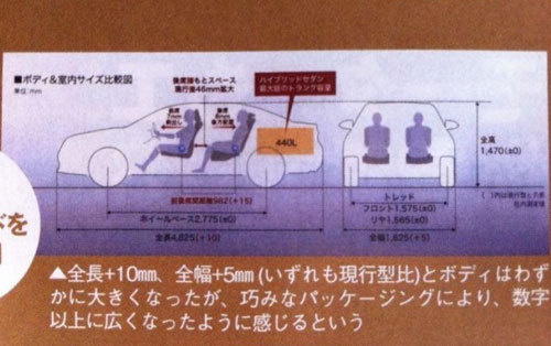 除此之外,曝光的數(shù)據(jù)表明,換代混動(dòng)版的長寬高分別為4825mm*1825mm*1470mm,軸距為2775mm,比現(xiàn)款車型長了10mm,加寬了5mm,但低了10mm,而行李箱容積也從389L提升至440L,后排腿部空間升至46mm。