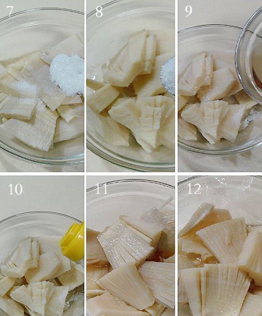 7、加入白糖拌勻; 8、撒少許味精拌勻; 9、倒入米酒拌勻; 10、滴幾滴香油; 11-12把筍拌好后,罩上保鮮膜放入冰箱腌制24小時; 13-14、吃的時候可以任意拼擺出不同的造型,比如,扇面形、魚形或者碼堆都可以。