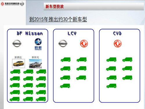 7月26日,東風(fēng)汽車有限公司在北京發(fā)布2011—2015年“新中期事業(yè)計(jì)劃”。據(jù)東風(fēng)汽車有限公司總裁中村公泰介紹:東風(fēng)汽車有限公司在2015年的銷量將由目前的100萬(wàn)輛擴(kuò)大到230萬(wàn)輛,銷售網(wǎng)絡(luò)由1400家擴(kuò)充到2400家。為了實(shí)現(xiàn)這個(gè)目標(biāo),東風(fēng)有限將推出30款左右的新車型,其中東風(fēng)日產(chǎn)將在這期間推出15款新車,其中包括2012年上市的自主品牌-啟晨的5款新車型。