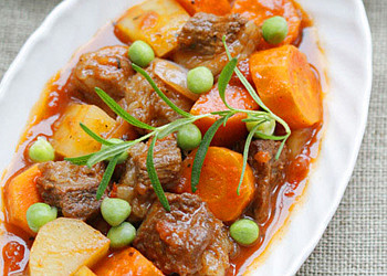原料:牛腩500克、紅番茄2個、洋蔥一個、土豆2個、胡蘿卜1根、青豌豆100克、番茄醬150克、茶葉一小把、姜、料酒、八角和香葉適量。 調(diào)料:橄欖油30ML,紅酒20L、黑胡椒粉5克、干迷迭香碎3克、羅勒3克、鹽適量。 做法: 1、將新鮮牛腩洗凈后切成塊,放入沸水中,加茶葉、鹽、姜、料酒、八角和香葉大火煮至牛肉軟爛;撈起瀝干水分備用; 2、將番茄、洋蔥、土豆、胡蘿卜洗凈,切成塊備用; 3、鍋中放入橄欖油,7成熱后倒進番茄片,加鹽翻炒,直到將番茄炒成醬;放入牛肉,炒干其水份; 4、放入番茄、洋蔥、土豆、胡蘿卜、青豌豆,翻炒均勻;加入淹沒材料的沸水; 5、加入番茄醬、紅酒、干迷迭香碎、羅勒、黑胡椒、鹽大火煮開,湯汁燒至濃稠即可。 |