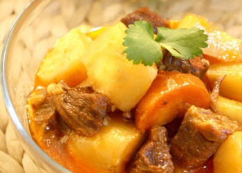 主料:牛肉500克、土豆500克、胡蘿卜200克、香菜一把。 配料:八角3只、五香粉5克、香葉2片、郫縣豆瓣20克、蔥5克、姜3片、大蒜5瓣、糖10克、酒一湯匙、生抽5克、花椒和鹽適量。 制作方法: 1、牛肉洗凈后切成塊,放進(jìn)沸水中,加入料酒,煮開瀝干水份待用; 2、將土豆、胡蘿卜切成塊備用; 3、鍋中油熱后加入土豆塊,炸至表皮金黃變脆; 4、鍋內(nèi)留適量的油,燒熱后加入蔥、姜、蒜;然后再放辣豆辨醬炒出香味; 5、放入牛肉塊翻炒5分鐘左右,將牛肉中的水份炒出; 6、加入醬油、糖、酒、生抽、五香粉及八角翻炒均勻; 7、加水浸過牛肉,放入高壓鍋內(nèi)壓15分鐘; 8、冷卻后再放入土豆和胡蘿卜壓制5分鐘; 9、如若沒有高壓鍋,可放入普通的燉鍋內(nèi),用小火慢慢煮至汁稠、肉酥香即可。 |