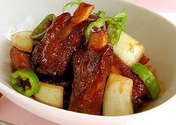材料:豬排骨300克、土豆500克、郫縣豆瓣醬2大匙(30ml)、醬油2大匙(30ml)、料酒1大匙(15ml)、姜末15克、大料2粒、花椒10粒、糖1小匙(5g)、鹽適量、油。 做法: 1、將剁成小塊的豬排骨用沸水焯變色,洗去血沫待用,豆瓣醬剁碎待用; 2、土豆去皮切成小塊,用清水浸泡片刻,除去變面淀粉,鍋中放入1大匙(15ml)油燒熱,將土豆放入煎至金黃,盛出待用; 3、炒鍋燒熱,放入2大匙(30ml)油,放入焯過水的排骨炒至金黃; 4、放入剁碎的豆瓣醬和姜末炒勻,炒出香味; 5、加入醬油、料酒炒勻; 6、加入適量開水(沒過排骨),燒開,加入大料和花椒; 7、加蓋轉(zhuǎn)小火燒20分鐘至排骨酥爛; 8、加入煎黃的土豆塊,燒5分鐘至湯汁收干,用鹽、糖調(diào)味即可。 |