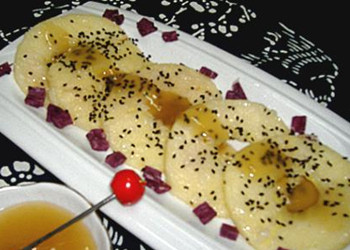 材料:蘋(píng)果2個(gè),啤酒一聽(tīng),泡打粉1克,白糖20克,黑芝麻10克,白醋少許(只用到幾滴),面粉適量,紫薯1個(gè) 做法: 1、將蘋(píng)果去皮,切成1厘米厚的原片,紫薯也去皮; 2、去掉蘋(píng)果中間的籽,放鹽水中腌制3分鐘; 3、啤酒50克,泡打粉1克,水50克,白醋3滴放面粉中攪拌; 4、鍋里放油燒5成熱; 5、蘋(píng)果片裹上面粉放油鍋里中火炸,兩門(mén)炸透后撈出來(lái); 6、另起鍋,放啤酒和水各80克,白糖20克,燒開(kāi)后加水淀粉出鍋; 7、蘋(píng)果擺盤(pán)撒上炒熟的芝麻,紫薯切塊放微波爐里轉(zhuǎn)熟放在蘋(píng)果邊上,淋上醬汁即可。 |