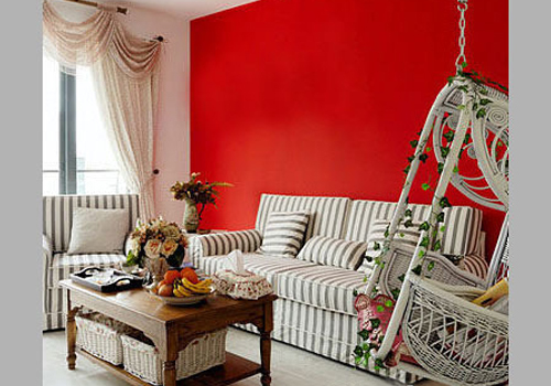 編輯點評:紅色通常被人認為是熱情的代表,但在這個空間里,紅色的墻面因為有了灰白色系家具和窗簾的勾兌,一點也不會顯得“熱”。 客廳