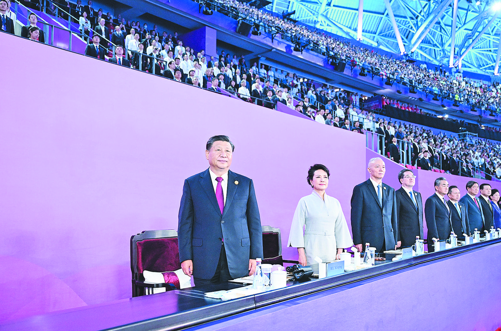 習(xí)近平出席開幕式并宣布本屆亞運會開幕 蔡奇丁薛祥 來自亞洲各地的領(lǐng)導(dǎo)人和貴賓等出席 潮涌錢江喜迎盛會,攜手同行共創(chuàng)未來。第十九屆亞洲運動會23日晚在浙江省杭州市隆重開幕。國家主席習(xí)近平出席開幕式并宣布本屆亞運會開幕。 蔡奇、丁薛祥,以及來自亞洲各地的領(lǐng)導(dǎo)人和貴賓等出席開幕式。 夜幕下,坐落在錢塘江畔的杭州奧體中心體育場華燈璀璨,流光溢彩。這座形如一朵大蓮花的建筑,見證著亞運圣火第三次在中國點燃。 開幕式開始前,來自浙江各地的群眾帶來富于地方特色的文藝表演,將現(xiàn)場氣氛烘托得十分熱烈。 19時58分,在《和平——命運共同體》的樂曲聲中,習(xí)近平和夫人彭麗媛,同亞奧理事會代理主席辛格、國際奧委會主席巴赫等步入主席臺,向觀眾揮手致意。全場響起長時間的熱烈掌聲。 9月23日,恰逢中國農(nóng)歷二十四節(jié)氣中的“秋分”。20時整,迎賓表演《水潤秋輝》在19座“水玉琮”敲擊出的激昂鼓聲中開始。隨著場地中央的倒計時數(shù)字,全場觀眾齊聲呼喊。地屏上,玉琮、玉鳥、神徽等印記與古城遺址一一浮現(xiàn),從碧綠到燦金,展現(xiàn)春耕秋收的自然軌跡,盡顯良渚文明之光、金色豐收之美。 場地中呈現(xiàn)出大好河山的壯闊景象,一條紅綢鋪展開來,伴著《我愛你中國》的深情旋律,8名儀仗兵邁著堅定的步伐,護衛(wèi)著中華人民共和國國旗走進現(xiàn)場。全場起立,高唱中華人民共和國國歌。五星紅旗冉冉升起,迎風(fēng)飄揚。 20時09分,運動員入場式開始。踏著輕快的樂曲《我們的亞細亞》,來自45個國家和地區(qū)的體育代表團相繼入場,受到全場觀眾的熱情歡迎!陡璩鎳返募ぐ盒身懫,東道主中國代表團最后入場,習(xí)近平起身揮手致意,全場一片歡騰,掌聲歡呼聲此起彼伏。中國代表團共1329人,其中參賽運動員886人,將參加本屆亞運會38個大項、407個小項的角逐。 杭州亞運會組委會主席、浙江省省長王浩在致辭中代表組委會和6500萬浙江人民向來自亞洲各個國家和地區(qū)的運動健兒表示最熱烈的歡迎,祝愿他們創(chuàng)造佳績、成就夢想、增進友誼、收獲幸福,讓美妙的杭州亞運之旅終生難忘。 杭州亞運會組委會主席、中國奧委會主席高志丹致辭時表示,在習(xí)近平主席和中國政府的親切關(guān)懷與堅強領(lǐng)導(dǎo)下,一屆精彩紛呈的亞運盛會即將拉開帷幕。讓我們弘揚奧林匹克精神,奮力創(chuàng)造亞洲體育新紀(jì)錄,合力繪就亞洲命運共同體的嶄新畫卷。 亞奧理事會代理主席辛格在致辭中,向中國政府、中國奧委會、浙江省政府、杭州市政府、亞組委和杭州市民以及所有參與籌備工作的人員致以最誠摯的敬意,稱贊杭州亞運會籌辦工作精彩絕倫,相信參與杭州亞運會的每一個人,都會收獲一段終生難忘的美好記憶。 21時16分,開幕式迎來激動人心的一刻。國家主席習(xí)近平宣布:杭州第十九屆亞洲運動會開幕!頓時,全場沸騰,“數(shù)字焰火”絢爛綻放,全場掌聲歡呼聲經(jīng)久不息。 8名我國優(yōu)秀運動員、教練員代表手執(zhí)亞奧理事會會旗入場。伴著亞奧理事會會歌,亞奧理事會會旗徐徐升起,同五星紅旗一道高高飄揚。 運動員鄭思維和孫穎莎、裁判員楊中民和高佳琦分別代表全體參賽運動員和裁判員宣誓。 燈光漸暗,大屏幕上,名為《相約杭州》的短片吸引了全場目光:杭州亞運會會徽穿越時光,在不同年代人們之間傳遞,向世界發(fā)出熱情邀約。 文藝表演《潮起亞細亞》拉開帷幕,表演分為上中下三部分。上篇《國風(fēng)雅韻》中,國風(fēng)少年以地為畫、踏墨而舞,宋韻女子亭亭玉立、翩然靈動,游船往來、燈影點點,全景立體影像構(gòu)筑的拱宸橋躍然于大運河之上,展現(xiàn)錢塘繁華和江南風(fēng)韻的雋永景象。中篇《錢塘潮涌》中,飛旋于空中的演員與潮共舞,“弄潮兒”乘著風(fēng)帆匯入潮流,吉祥物“江南憶”破水而出、騰躍跳動,激發(fā)起活力澎湃的運動浪潮。下篇《攜手同行》中,“白鷺精靈”遨游星海之中,隨著悠揚的歌聲和清麗的越劇唱腔,數(shù)百名大學(xué)生手持發(fā)光金桂點亮綿延悠長的“金桂之江”,亞洲各個國家和地區(qū)的地標(biāo)性建筑共同呈現(xiàn),構(gòu)成各美其美、美美與共的亞洲畫卷。精彩紛呈的表演,深深打動了現(xiàn)場觀眾。 21時53分,主火炬點燃儀式開始。采集自良渚古城遺址的亞運圣火,自9月8日起在浙江各地傳遞,最終抵達杭州奧體中心體育場。 體育場內(nèi),葉詩文、樊振東、徐夢桃、石智勇、李玲蔚、汪順等6名火炬手接力奔跑,贏得全場熱烈掌聲。與此同時,現(xiàn)場大屏幕上,由超過1億人參與數(shù)字火炬?zhèn)鬟f而匯聚成的“數(shù)字火炬手”,高擎火炬奔赴而來。“錢江潮涌”主火炬塔緩緩打開。萬眾矚目中,最后一棒火炬手汪順與“數(shù)字火炬手”一道點燃“錢江潮涌”主火炬塔,亞運圣火熊熊燃燒。 “我們同擁有一個家,心相融、愛相加”“億萬個驕傲的聲音,匯聚成一句話,你和我同住亞細亞”……全場共同演唱杭州亞運會主題歌《同愛同在》,整座體育場化作歡樂的海洋。 出席開幕式的國際貴賓有:柬埔寨國王西哈莫尼、敘利亞總統(tǒng)巴沙爾和夫人阿斯瑪、科威特王儲米沙勒、尼泊爾總理普拉昌達、東帝汶總理夏納納、韓國總理韓德洙、馬