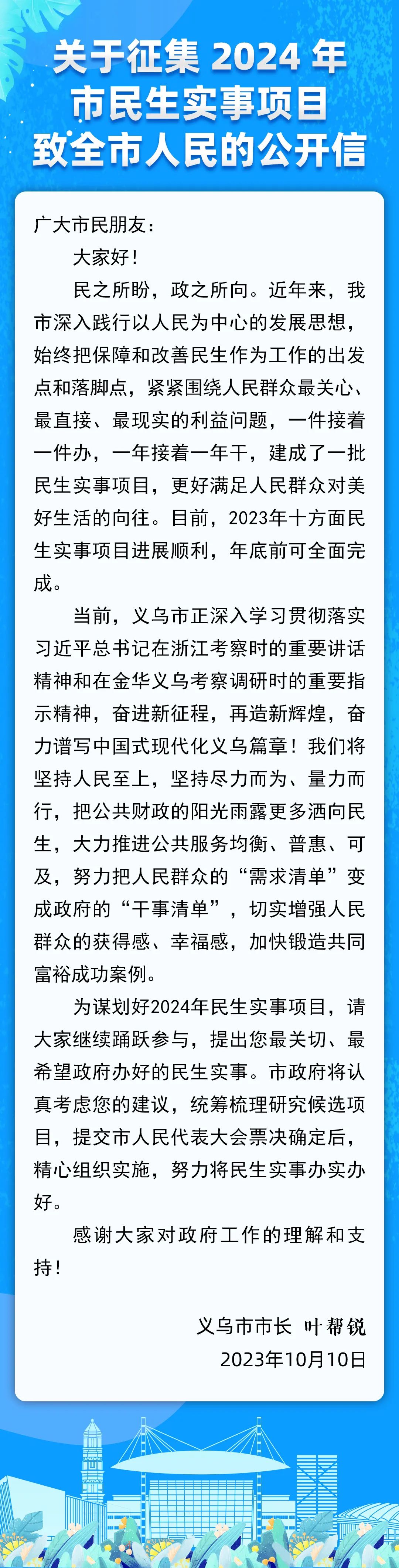 義烏市人民政府關(guān)于 公開(kāi)征集2024年民生實(shí)事項(xiàng)目的公告 人民對(duì)美好生活的向往,就是我們奮斗的目標(biāo)。為更好地解決人民群眾最關(guān)心、最直接、最現(xiàn)實(shí)的民生問(wèn)題,確保民生實(shí)事更加順應(yīng)民意、反映民情、貼近民需,市政府決定在全市范圍內(nèi)公開(kāi)征集2024年度義烏市民生實(shí)事項(xiàng)目,具體公告如下: 一、征集日期 自公告發(fā)布之日起至10月31日止。 二、征集內(nèi)容 緊扣保障和改善民生需求,圍繞住房保障、教育助學(xué)、衛(wèi)生醫(yī)療、交通出行、文化體育、食品安全、環(huán)境治理、市政建設(shè)、社會(huì)保障、養(yǎng)老助殘、社會(huì)治安、便民服務(wù)等民生領(lǐng)域的意見(jiàn)建議。 三、征集原則 (一)合規(guī)性。應(yīng)符合國(guó)家法律、法規(guī)和相關(guān)政策規(guī)定,符合我市經(jīng)濟(jì)和社會(huì)發(fā)展規(guī)劃。 (二)普惠性。應(yīng)著眼于提高群眾生活質(zhì)量和水平,符合群眾關(guān)注度高、覆蓋面廣、受益面大等特點(diǎn),惠及大多數(shù)群眾。 (三)可行性。應(yīng)立足義烏發(fā)展實(shí)際,盡力而為、量力而行,具有較強(qiáng)的針對(duì)性和可操作性。 (四)實(shí)效性。應(yīng)解決群眾所急所盼,原則上能當(dāng)年立項(xiàng)、當(dāng)年完成、當(dāng)年見(jiàn)效,具有較強(qiáng)的社會(huì)效益。 四、征集方式 您可通過(guò)以下方式提出您的民生實(shí)事項(xiàng)目建議: (一)網(wǎng)站征集。登錄義烏政府門(mén)戶(hù)網(wǎng)站(http://www.yw.gov.cn) “民生實(shí)事”征集專(zhuān)欄進(jìn)行建言。 (二)公眾號(hào)征集。搜索關(guān)注義烏發(fā)布、愛(ài)義烏等微信公眾號(hào),進(jìn)入后點(diǎn)擊最下方 “民生實(shí)事”欄目,進(jìn)入征集頁(yè)面,根據(jù)頁(yè)面提示填寫(xiě)您的信息和建議。 (三)熱線(xiàn)征集。撥打義烏市民服務(wù)熱線(xiàn)12345(96150),提出您的建議。 (四)信函征集。填寫(xiě)2024年民生實(shí)事項(xiàng)目征集表,并將您的建議郵寄至義烏市人民政府辦公室(地址:義烏市縣前街21號(hào),郵編:322000),請(qǐng)?jiān)谛欧馍蟼渥ⅰ懊裆鷮?shí)事”字樣。截止日期以郵戳為準(zhǔn)。 |