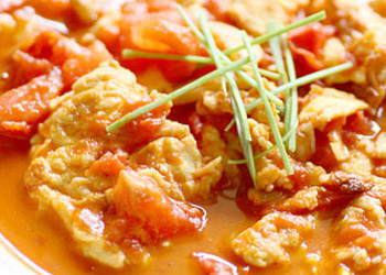 原料:熟透西紅柿2-3個、雞蛋2-3只、花椒、大蒜、大蔥適量; 配料:鹽、糖、食用油、料酒少許。 做法: 1、西紅柿去蒂,切成厚片,切熟透的西紅柿很容易流汁,可以將皮朝下,橫斷面朝上,這樣下刀就好切多了; 2、雞蛋打散,切好蔥花蒜片備用; 3、鍋燒熱,放入雞蛋,旺火炒,雞蛋進去立即邊上會膨脹的狀態(tài),雞蛋炒到老一點,表面為金黃色,盛出備用; 4、再加少量油,放入花椒,炸成黑色撈出,熗入蔥花蒜片,炒出香味兒后放入西紅柿,炒幾下,加一點料酒一點鹽,湯汁黏稠時,加入一點糖,和足夠調(diào)味的鹽,加入雞蛋。翻炒片刻滴幾滴麻油即可出鍋,點綴香菜或香蔥裝盤。 |