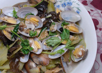 原料: 苦瓜25克,文蛤500克,料酒,精鹽,蒜,姜汁,白糖,香油,食油各適量。