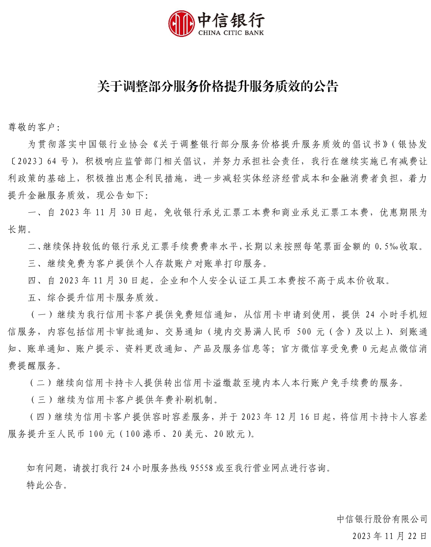 近年來,中信銀行始終踐行金融的政治性和人民性,深入貫徹國家決策部署,認(rèn)真落實(shí)監(jiān)管政策要求,聚焦實(shí)體經(jīng)濟(jì),不斷加大減費(fèi)讓利力度,將惠企利民落到實(shí)處。 踐行社會(huì)責(zé)任,服務(wù)大局“勇?lián)?dāng)” 近年來,在經(jīng)濟(jì)下行、疫情沖擊的影響下,不少實(shí)體企業(yè)出現(xiàn)經(jīng)營困難。中信銀行積極履行國有金融企業(yè)使命擔(dān)當(dāng),為服務(wù)實(shí)體經(jīng)濟(jì)貢獻(xiàn)中信力量。 一方面持續(xù)加大信貸投放,尤其是向普惠、民營、制造業(yè)、涉農(nóng)、綠色、戰(zhàn)略性新興產(chǎn)業(yè)等重點(diǎn)領(lǐng)域傾斜;另一方面全面落實(shí)各項(xiàng)減費(fèi)讓利政策,從嚴(yán)執(zhí)行“一通知兩倡議”和小微企業(yè)收費(fèi)“兩禁兩限”規(guī)定,主動(dòng)改“限”為“禁”,執(zhí)行“四禁”政策;免收小微企業(yè)銀承敞口費(fèi)、詢證函費(fèi);主動(dòng)承擔(dān)全部客戶的房屋抵押登記費(fèi)及押品評(píng)估費(fèi)等。尤其是疫情嚴(yán)重時(shí)期,在存取款、轉(zhuǎn)賬、賬戶基礎(chǔ)服務(wù)等方面推出專項(xiàng)免費(fèi)政策,降低市場(chǎng)主體經(jīng)營成本,用實(shí)際行動(dòng)助力經(jīng)濟(jì)發(fā)展。 支持實(shí)體經(jīng)濟(jì),減費(fèi)讓利“重實(shí)效” 2023年10月12日,中國銀行業(yè)協(xié)會(huì)發(fā)布《關(guān)于調(diào)整銀行部分服務(wù)價(jià)格提升服務(wù)質(zhì)效的倡議書》(以下簡稱《倡議書》),隨后中信銀行與各家國有銀行、股份制銀行立即發(fā)布公告,積極響應(yīng)減費(fèi)讓利五項(xiàng)倡議。11月22日中信銀行與招商、興業(yè)、光大、浦發(fā)、民生、平安等多家股份制銀行再次集體發(fā)聲,發(fā)布落地實(shí)施公告,明確五項(xiàng)倡議的具體實(shí)施時(shí)間。 中信銀行一貫保持較低的收費(fèi)標(biāo)準(zhǔn),在倡議書發(fā)布之前,已滿足銀行承兌匯票手續(xù)費(fèi)降至萬分之五、個(gè)人存款賬戶對(duì)賬單免費(fèi)打印、提升信用卡服務(wù)質(zhì)效的倡議要求,在實(shí)施已有減費(fèi)讓利政策的基礎(chǔ)上,進(jìn)一步推出惠企利民措施,包括:(1)自2023年11月30日起,免收銀行承兌匯票工本費(fèi)和商業(yè)承兌匯票工本費(fèi),企業(yè)和個(gè)人安全認(rèn)證工具工本費(fèi)按不高于成本價(jià)收。唬2)自2023年12月16日起,信用卡持卡人容差服務(wù)提升至人民幣100元。 提升服務(wù)質(zhì)效,惠企利民“出實(shí)招” 為進(jìn)一步落實(shí)小微企業(yè)各項(xiàng)減費(fèi)讓利政策,規(guī)范全行服務(wù)收費(fèi)行為,中信銀行持續(xù)推進(jìn)業(yè)務(wù)與科技深度融合,將減費(fèi)讓利政策嵌入業(yè)務(wù)系統(tǒng),在系統(tǒng)前端增加小微企業(yè)減費(fèi)讓利剛性控制,實(shí)現(xiàn)貸款承諾、法人賬戶透支、銀承敞口費(fèi)等多種業(yè)務(wù)“小微企業(yè)自動(dòng)免收費(fèi)”功能。 長期以來,中信銀行致力于成為“有擔(dān)當(dāng)、有溫度、有特色、有價(jià)值”的最佳綜合金融服務(wù)提供者,聚焦人民群眾的日常金融需求,以全行數(shù)字化轉(zhuǎn)型為契機(jī),努力提供更加便捷、高效、安全、智能的數(shù)字化服務(wù),推出滿足不同消費(fèi)者實(shí)際需求的創(chuàng)新金融產(chǎn)品,提升客戶滿意度,與廣大金融消費(fèi)者形成長期穩(wěn)定的共贏合作關(guān)系。 積蓄發(fā)展勢(shì)能,銀行客戶“互促進(jìn)” 近年來,中信銀行堅(jiān)決落實(shí)黨中央、國務(wù)院決策部署,堅(jiān)持穩(wěn)中求進(jìn)工作總基調(diào),牢牢把握高質(zhì)量發(fā)展首要任務(wù),始終堅(jiān)持把發(fā)展的著力點(diǎn)放在服務(wù)實(shí)體經(jīng)濟(jì)上、提升客戶滿意度上,持續(xù)增強(qiáng)對(duì)國民經(jīng)濟(jì)重點(diǎn)領(lǐng)域和薄弱環(huán)節(jié)的精準(zhǔn)支持,切實(shí)提升服務(wù)實(shí)體經(jīng)濟(jì)質(zhì)效。在增強(qiáng)客戶的獲得感、認(rèn)同感的同時(shí),自身發(fā)展也迎來了新的機(jī)遇和突破,經(jīng)營情況穩(wěn)中向好,努力實(shí)現(xiàn)了服務(wù)實(shí)體經(jīng)濟(jì)和自身高質(zhì)量發(fā)展雙提升、互促進(jìn)。 未來,中信銀行將以中央金融工作會(huì)議精神為指引,堅(jiān)決貫徹落實(shí)黨中央關(guān)于金融工作的部署,履行金融擔(dān)當(dāng),展現(xiàn)金融作為,為實(shí)體經(jīng)濟(jì)發(fā)展提供強(qiáng)有力的支撐。 |