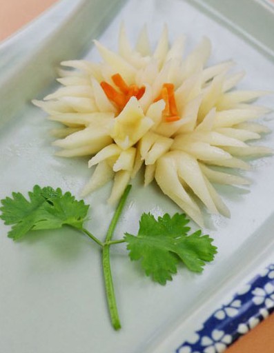 今天這道麗花茭白就是蘇菜的代表菜之一,初聽這名字,著實(shí)引起了我的好奇心。茭白是我很喜歡吃的一種蔬菜,這食材好找,可是麗花,沒見過更沒吃過,是一種什么花呢… 后來偶然看到了菜的造型,我才恍然大悟,原來,麗花茭白不是麗花炒茭白,而是形似大麗花的茭白… 麗花茭白是一款涼拌菜,吃起來口感清新爽脆,是非常不錯的開胃小菜。做法也不難,但雕花還是需要花點(diǎn)兒小心思,花瓣太大或太小都會影響最后的造型。另外,注意花瓣不要雕得太薄,那樣會缺乏立體感。 非常簡單的一道解暑涼菜,但勝在造型獨(dú)特,形似雅致的大麗花,清麗脫俗。無論日常三餐,還是家宴聚會,都是不錯的選擇,會為夏日的餐桌帶來一抹清新風(fēng)。
