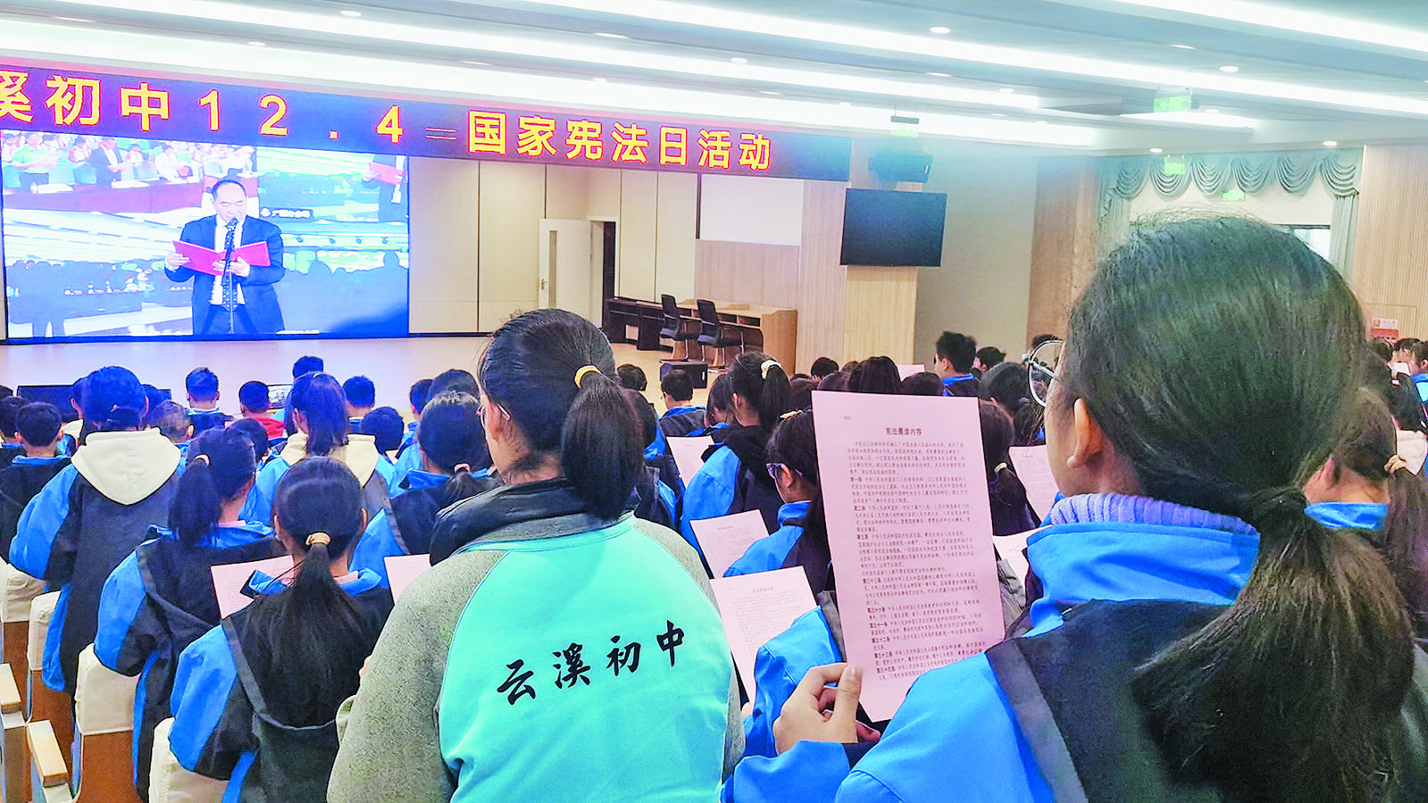 今年12月4日是第十個國家憲法日。當天,大陳鎮(zhèn)云溪初中的師生們一起讀憲法、學憲法,樹立正確法治觀念,讓遵紀守法的種子根植在每個云溪學子心中,為建設(shè)法治社會貢獻青春力量。