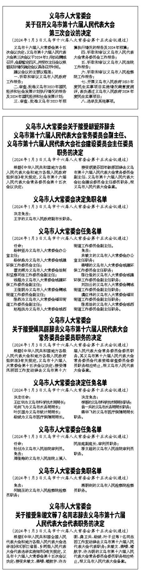 昨日下午,市十六屆人大常委會舉行第十五次會議。市人大常委會主任丁政主持會議,副主任董利明、顏新香、虞秀軍、斯基根、鮑建鋒及委員33人參加會議。 副市長羅祖盤,市法院院長吳傳檔,市檢察院、市監(jiān)察委員會負(fù)責(zé)人,市府辦負(fù)責(zé)人,市人大常委會各委辦、市人大專門委員會負(fù)責(zé)人列席會議。 會議審議并表決通過了有關(guān)人事事項。新任命國家工作人員進(jìn)行了憲法宣誓。 會議審議通過了《關(guān)于召開義烏市十六屆人大三次會議的決定》。 |