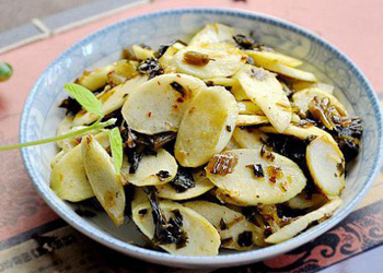 3、下入茭白,加少許鹽,翻炒均勻——鹽不必太多,比平常炒菜時的用量要少一點;
