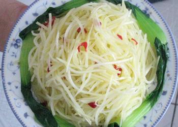 7、油和辣椒一同潑在土豆絲上拌勻即可。