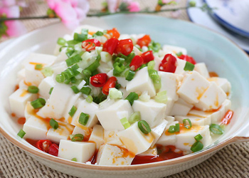 5、把拌好的剁椒韭菜連同湯汁澆在切好的熱豆腐上即可。