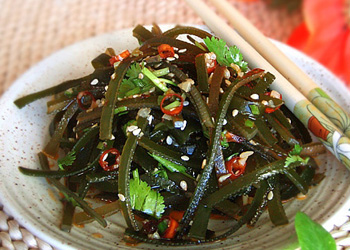 原料:新鮮海帶一根、熟芝麻、大蒜、香菜、干紅辣椒。 配料:鹽、糖、生抽、醋、味精、玉米油。 做法: 1、新鮮的海帶在開水中焯一下; 2、海帶顏色由褐變綠馬上撈出,沖涼水; 3、洗去海帶表面的雜質(zhì),用清水浸泡兩小時,中間換水一次; 4、海帶撈出瀝干水分,切成海帶絲; 5、大蒜搗成泥、紅椒剁成碎、香菜切成碎備用; 6、紅椒、蒜泥、熟芝麻添加鹽、糖、生抽、醋、味精攪拌勻均勻; 7、玉米油燒熱澆在碗汁里; 8、碗汁澆入海帶絲,撒上香菜即可。 |