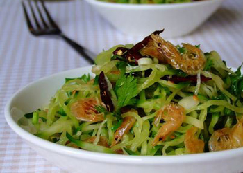 原料: 綠蘿卜、蝦皮、干紅辣椒、花椒、小蔥、香菜、香油。 做法: 1、蝦皮用清水沖洗干凈,然后在開水中浸泡8分鐘; 2、撈出瀝干水分后,入油鍋小火烘干至脆香,盛出晾涼; 3、蘿卜洗凈,切細(xì)絲; 4、用適量鹽拌勻蘿卜絲,腌制5分鐘; 5、紅椒切碎,小蔥和香菜切碎備用; 6、腌好的蘿卜絲擠去水分,添加香醋、白糖和味精拌勻; 7、香油入熱鍋,下入花椒小火炸香,剔除花椒,撒入干紅辣椒絲,馬上關(guān)火; 8、油和紅椒趁熱澆在蘿卜絲上,撒上蔥花和香菜碎拌勻; 9、撒上晾涼的蝦皮即可。 |
