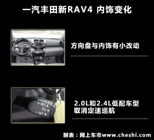RAV4定位于城市SUV,兼?zhèn)湓诔鞘械缆泛驮揭奥范蔚膬?yōu)異行駛性能。自09年4月份上市以來(lái)憑借超高的性?xún)r(jià)比得到眾多SUV車(chē)友的喜愛(ài)。近日記者從一汽豐田內(nèi)部知情人士處了解到:豐田城市SUV-RVV4將于9月份左右推出小改款車(chē)型,其中2.0L增加4驅(qū)版的車(chē)型,兩款低配車(chē)型取消了定速巡航。下面就讓我們一起來(lái)了解一下這款車(chē)哪些方面做出了改動(dòng)。 外觀(guān)部分變化