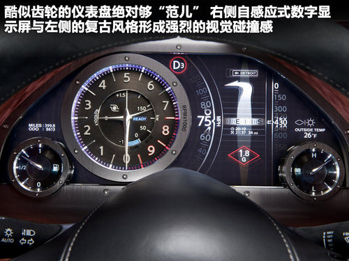 儀表臺采用的是復(fù)古風(fēng)格,酷似齒輪的圓盤十分個(gè)性,清晰的刻度源自手表設(shè)計(jì),右側(cè)的數(shù)字指示完全為自感應(yīng),實(shí)用性與時(shí)尚感兼顧。同樣,變速器換擋桿也融入了齒輪設(shè)計(jì)風(fēng)格,鍍鉻材質(zhì)賦予其出色的質(zhì)感。