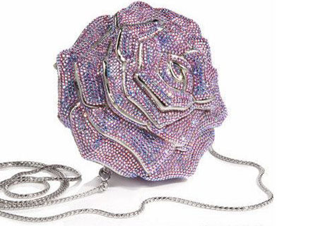 Judith Leiber的純手工手包是玫瑰花瓣的形狀,花葉由粉色奧地利磨砂水晶鑲嵌,銀色花邊,下推按扣,包鏈可隱藏于內部。這款精致的晚裝手包蘊涵了都市之夜的無限璀璨。玫瑰花瓣的設計更添獨特魅力。