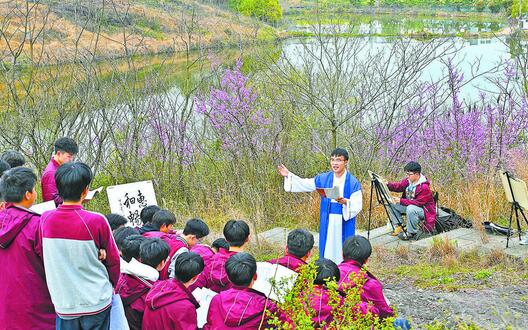 近日,義烏市樹人中學(xué)師生開展《蘭亭集序》教學(xué)體驗(yàn)活動(dòng)。置身于湖光山色、茂林繁花的大自然中,大家一起吟詠古文佳句,并選用一段話、一句詩、一幅畫去“臨摹”春天的詩意。