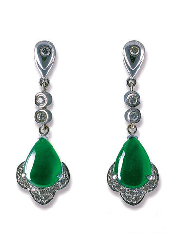 正陽綠翠:昭儀翠屋玻璃種翡翠K金配鑲祖母綠耳墜 翡翠的瑩潤(rùn)氣質(zhì),如一汪將要凝固的水珠,兩枚冰種正陽綠大小相同能形成耳墜,真是非常難得的新娘飾品。