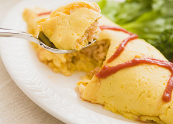 3、迅速將作法2的蛋皮四角包好固定,盛入盤中,淋上蕃茄醬即可。