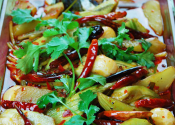 材料:草魚1條、香芹菜50克、青筍1根、絲瓜1根、姜20克、大蒜100克、干辣椒100克、泡椒20克、花椒15克、郫縣豆瓣2大匙(30ml)、豆豉醬1湯匙(15ml)、醬油1大匙(15ml)、鹽適量、糖1茶匙(5克)、雞精少許、鮮湯250ml、油。 腌魚調(diào)料:蔥、姜片、鹽、料酒、辣椒面、花椒面、孜然粉、醬油、油。 做法: 1、將宰殺干凈的新鮮草魚洗凈,剪去魚鰭,用刀在魚身兩側(cè)開花刀,然后沿魚骨將魚部分分開,使魚分成兩半,魚背相連,用蔥段、姜片、1勺(5ml)料酒和1茶匙(5克)的鹽抹勻魚身,腌制10分鐘; 2、將腌好的魚放入鋪好錫紙的烤盤,墊上蔥段和姜片,魚身刷上油和醬油,撒上辣椒面、花椒面、孜然粉,放入預(yù)熱220度的烤箱上下火烤20分鐘(中間可以取出再刷一次醬油和油); 3、姜切姜末,蒜切成大塊,芹菜去老葉洗凈切段,豆瓣醬、泡椒剁碎,青筍去皮切滾刀塊,絲瓜去皮切滾刀塊; 4、炒鍋內(nèi)放入50克的油,燒至5成熱,放入姜末蒜瓣炒香,放入剁碎的豆瓣、泡椒和豆豉醬炒香; 5、放入干辣椒和花椒炒香,加入鮮湯燒開,加醬油、鹽、糖、雞精調(diào)味; 6、加入青筍和香芹菜同煮,斷生后加入絲瓜即關(guān)火; 7、將烤好的魚去掉姜蔥放入一個(gè)深盆中將配菜倒在魚身上; 8、將加了配菜的魚放入烤箱中200度烤5分鐘; 9、炒鍋洗凈燒熱,放入2大匙(30ml)的油燒至5成熱,放入適量干辣椒花椒炒香,趁熱澆在烤好的魚身上,用香菜裝飾即可上桌。 |