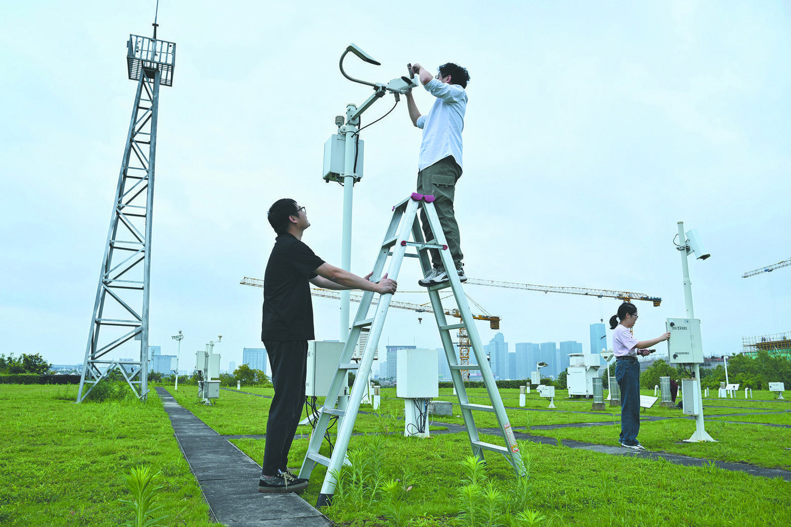 昨日,在義烏市國家基本氣象站,市氣象局技術人員正在對氣象百葉箱、翻斗式雨量傳感器等預報預警設備儀器進行定期維護和檢查。