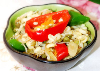 原料:綠豆芽200g、青尖椒1根、紅尖椒1根、蒜2瓣、姜2片、醋2茶匙、鹽少許。