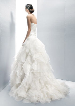 柔美的蕾絲和薄紗完美結(jié)合,魚尾款式塑造出新娘完美的身型;腰間一側(cè)裝飾精致的花朵,散發(fā)優(yōu)雅氣質(zhì)。