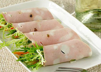 3、將意大利博洛尼亞香腸片卷起,用刀從中間切開擺盤即可;