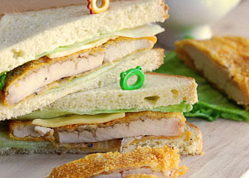 原料: 雞胸1個、粟粉適量、雞蛋1個、生抽1湯勺、鹽1茶匙、料酒1湯勺、黑胡椒1茶匙、包屑適量、芝士片1片、生菜葉數(shù)片面、沙拉醬適量。 做法: 1、雞胸從側(cè)面片開成兩片; 2、取一片用刀背剁松散; 3、撒上黑胡椒和鹽調(diào)味; 4、淋上生抽、料酒腌制15分鐘左右; 5、取出腌制好的雞胸肉,沾滿粟粉; 6、再放到蛋液中浸濕; 7、雙面都拍上面包屑; 8、煎鍋中倒入少許油,小火把雞排煎至兩面金黃; 9、煎好的雞排切成塊,面包片上放上一片生菜,一塊雞排; 10、芝士片對角切開,再在雞排上面放上一片芝士片; 11、再蓋上一片生菜,擠上沙拉醬; 12、最后取一片面包片蓋在上面,按住兩個對角,沿另外對角線切開即可。 |