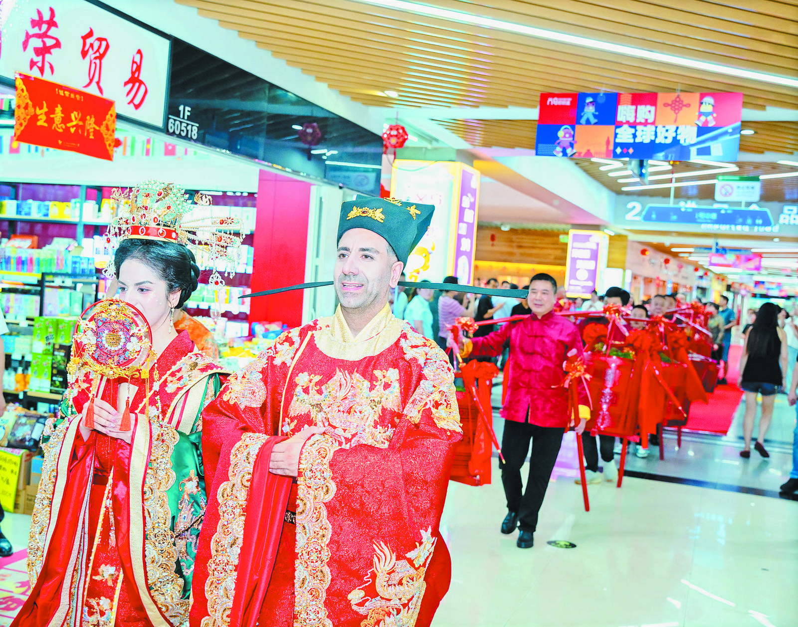 5月20日,華燈初上,國際商貿(mào)城五區(qū)市場一樓洋溢著喜慶氛圍。商城集團(tuán)國際商貿(mào)城第五分公司結(jié)合市場夜間營業(yè)特色,充分發(fā)揮資源優(yōu)勢,聯(lián)合婚慶喜慶用品行業(yè)商會(huì),共同舉辦“夜五區(qū) 購精彩——五區(qū)市場義烏十八擔(dān)婚俗秀展演活動(dòng)”。 活動(dòng)現(xiàn)場,2對(duì)“新人”、外國友人,以及五區(qū)9大行業(yè)的商會(huì)會(huì)長、秘書長齊聚一堂,共同見證義烏傳統(tǒng)十八擔(dān)婚俗文化的精彩還原,為觀眾呈現(xiàn)了一場別具特色的地方民俗文化盛宴。 |