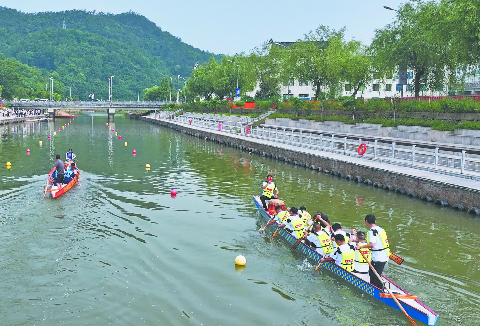 昨日,大陳鎮(zhèn)紅旗村大陳江畔鼓聲陣陣,龍舟破浪,部分龍舟隊(duì)正在這里加緊訓(xùn)練,齊心備戰(zhàn)將于5月31日舉行的義烏市第七屆“產(chǎn)投杯”大陳龍舟賽。