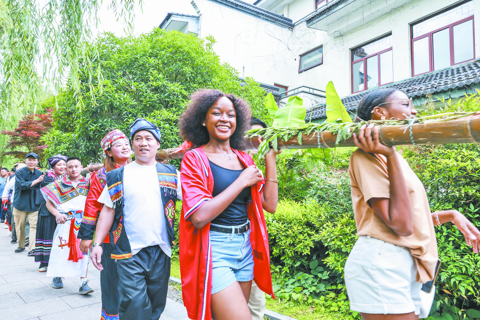 你見過百米長的粽子嗎?昨日,城西街道“絲路粽情 富路同行”百米長粽迎端午活動在何斯路村舉行?傞L288米、總重近2000公斤的巨型“龍粽”,吸引了5000余名中外嘉賓、游客、村民來到現(xiàn)場。 百米“龍粽” 一年更比一年長 上午9時,當(dāng)天活動在東河小學(xué)學(xué)生的古風(fēng)演奏中開場。碧波蕩漾的志成湖上,動人演奏與村民戲劇表演相映成趣,古韻悠然。隨后,夏演村大鼓隊的激昂表演拉開“龍粽”巡游序幕。 “太震撼了,從來沒見過這么長的粽子!”活動現(xiàn)場,百米長桌上,兩條身裹菖蒲、艾草,以竹節(jié)為底的長粽靜靜躺在桌上,似兩條長龍臥在志成湖畔。往來游客無不稱奇,紛紛舉起手機(jī)拍照發(fā)“圈”。 “包長粽是我們何斯路人的傳統(tǒng)習(xí)俗!焙嗡孤反妩h總支書記何允輝說,隨著鄉(xiāng)村振興不斷深入,不僅來村里的國際友人、外來游客越來越多,活動越來越豐富,“龍粽”也是越包越長。2019年第一屆為108米,2023年增加到168米,去年是234米!敖衲昕傞L288米,共有兩條,分別為168米和120米,由二十多位村中巧娘花費(fèi)一周時間,用白糯米、烏米配上臘肉、鮮肉等材料精心制作而成。” “龍粽”巡游 中外友人共襄盛舉 隨后,經(jīng)過外國友人代表與村中長者共綁“同心粽”、點(diǎn)睛等儀式,兩條“龍粽”在來自世界各地的國際友人、少數(shù)民族同胞、游客、望道中學(xué)學(xué)生和村民共計300多人的托舉下,開始繞村巡游!褒堲铡贝┙肿呦铮瑸榧壹覒魬羲腿ァ跋矚狻。約一個小時后,巡游隊伍在鞭炮齊鳴中重返志成湖畔。 盡管“龍粽”分量不輕,參與者仍興致盎然。烏克蘭留學(xué)生Mosin感慨:“這是我第一次體驗(yàn)中國端午節(jié),村民的熱情和文化的魅力讓我愛上這里。”巴勒斯坦留學(xué)生Aday則表示,通過活動更深切理解了端午“祈福納祥”的內(nèi)涵。 望道中學(xué)9年級學(xué)生詹芷優(yōu)全程參與了迎“龍粽”儀式。“這是我第一次扛這么重的粽子,付出了汗水,也收獲了祝福!彼f,馬上中考,“一舉高中”的祝福讓她覺得特別溫暖。巡游結(jié)束后,由村中長壽老人為“龍粽”啟封,開始“長粽宴”。 據(jù)悉,今年“絲路粽情 富路同行”百米長粽迎端午活動還聯(lián)動分水塘村與石明堂村,分別以“紅色根脈”與“共富工坊”為主題,邀請外國友人、少數(shù)民族代表與村民共包“真理粽”,齊制“共富香囊”。城西街道還以“城西臻禮”為名,推出全新端午粽禮系列產(chǎn)品,希望這場以“粽”為媒,融合傳統(tǒng)民俗、非遺展演與國際文化交流的活動,能夠充分展現(xiàn)和美鄉(xiāng)村幸福圖景,也讓更多的國際友人了解中華文化的獨(dú)特魅力。 |